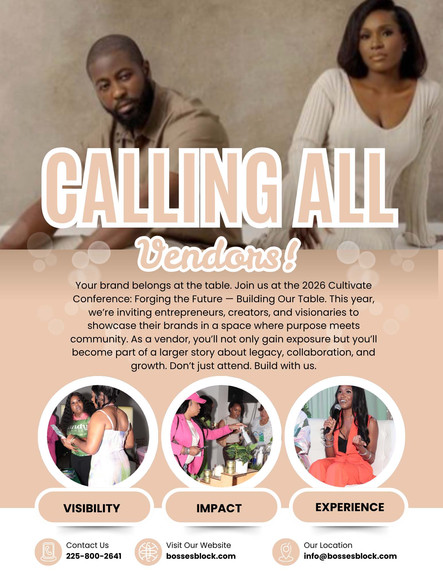Want to showcase your business at this Empowerment Experience? Contact Lex first before purchasing vendor spot! The vendors of the Cultivate Conference get an all inclusive experience. Your vendor tickets includes you and a plus one, meals for both of you and all the perks of attending the conference including a swag bag!